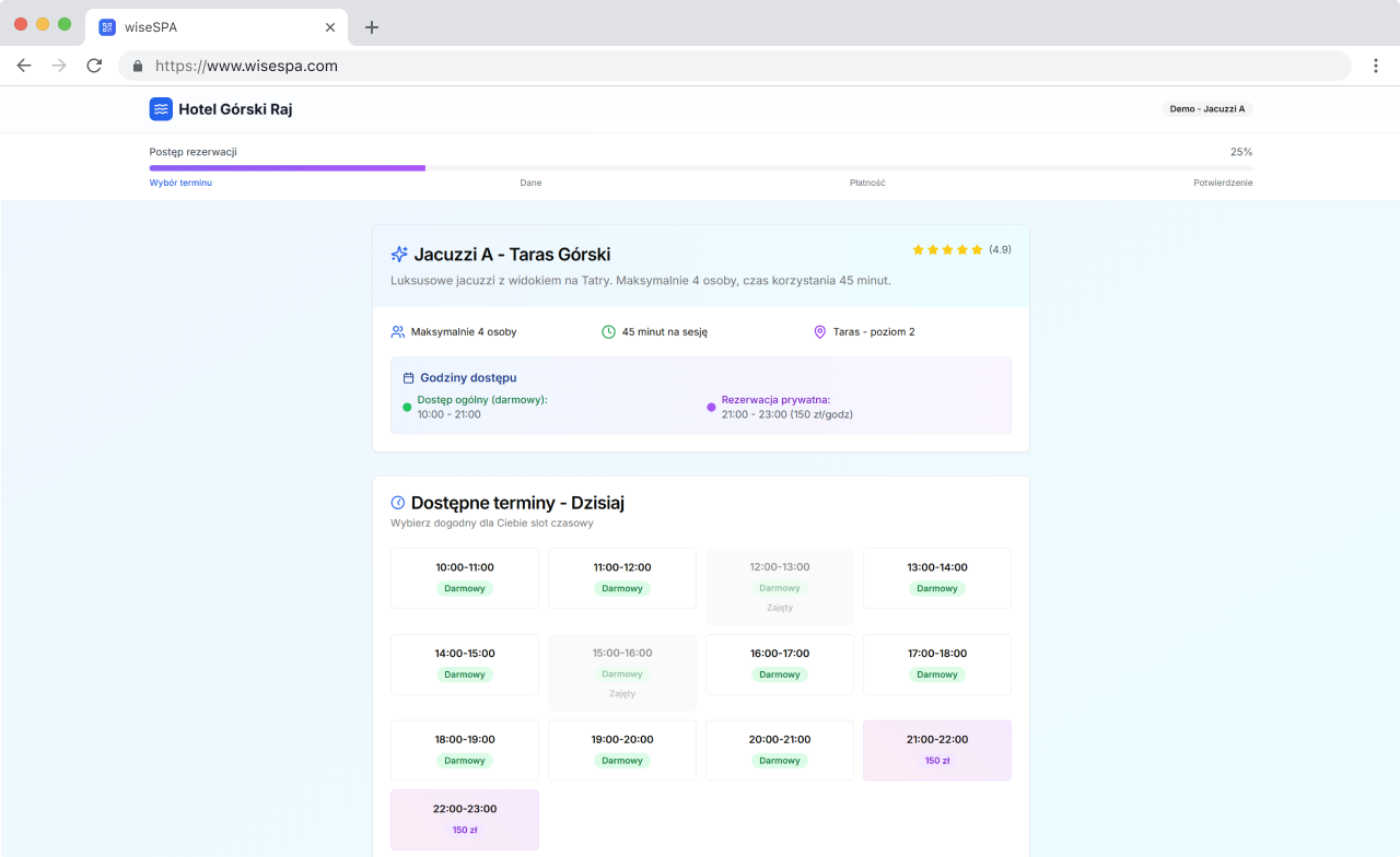 System automatycznie blokuje 30 minut między rezerwacjami na przygotowanie jacuzzi.